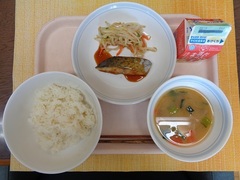 ごはん 牛乳 魚の照り焼き もやしの和え物 具沢山汁