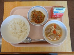 今日の給食では、厚揚げをたっぷりと使い、豚肉や白菜と炒め合わせて、みそ味に仕上げました。
