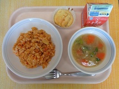 チキンライス 牛乳 コンソメスープ ポムポムケーキ