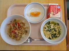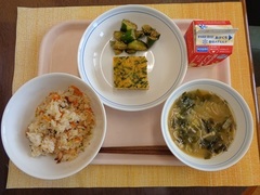 たこめし 牛乳 卵焼き ピリ辛きゅうり もやしのみそ汁