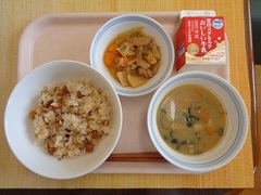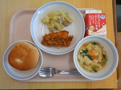 山坂達者飯 牛乳 鶏肉と野菜の炒め物 かいのこ汁