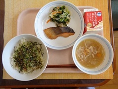 ごはん 青のりふりかけ 牛乳 鮭のみそバター焼き 野菜のポン酢和え 冬瓜汁