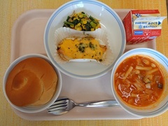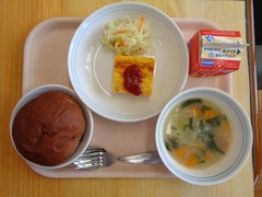 チョコチップパン 牛乳 チーズオムレツ コールスローサラダ 野菜スープ
