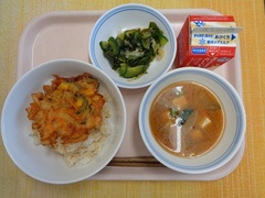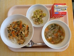 ゴーヤ入りかき揚げ丼 牛乳 わかめときゅうりの甘酢和え 豚汁