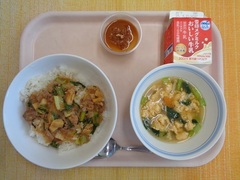 チンジャオロース丼 牛乳 トマトと卵のスープ アップルゼリー