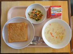 セサミトースト 牛乳 シーフードシチュー ビーンズサラダ