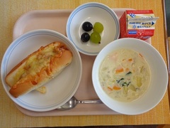 ツナピザドッグ 牛乳 野菜のクリームスープ ぶどう(食べ比べ)