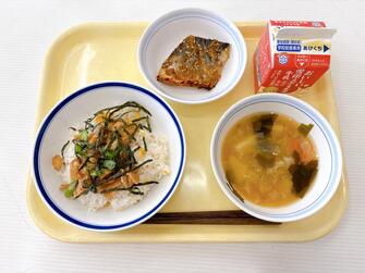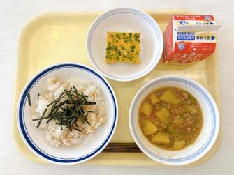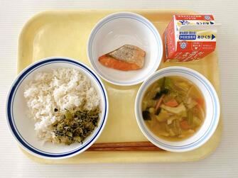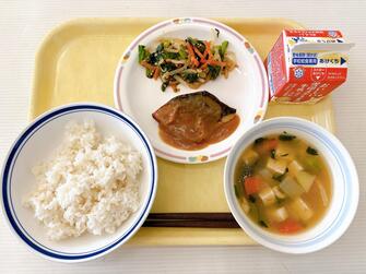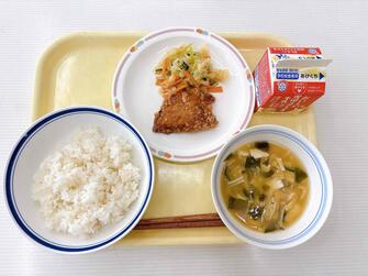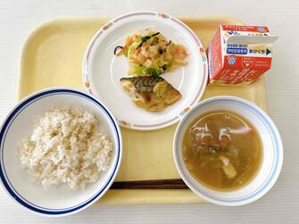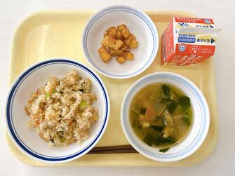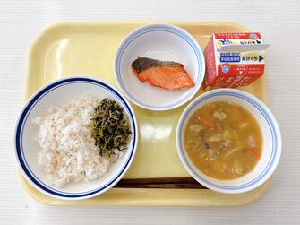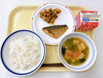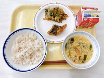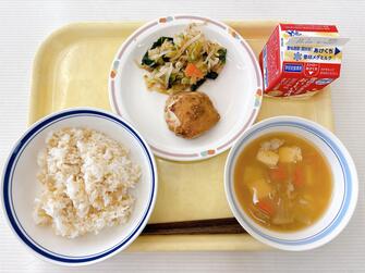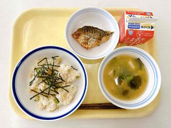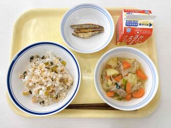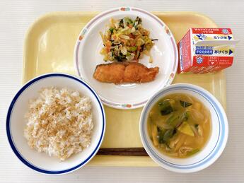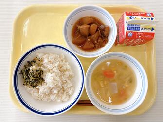 今日は春が旬の野菜をたっぷり使った献立です。新たけのこは、鹿児島県産の採れたてのものを使用しています。みそ汁には、春キャベツや新玉ねぎ、新じゃがいも、スナップエンドウが入っています。魚はこどもたちには少し辛かったようですが、よく食べてくれていました。