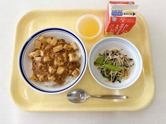 今日の麻婆豆腐丼は冷凍豆腐を使用しています。国産大豆使用で消泡剤不使用、なめらかな絹ごし食感で食べやすいです。いままで崩れにくい木綿豆腐を使用していましたが、冷凍豆腐は絹でも崩れにくいため、新たに採用することとしました。「このお豆腐、いつもと違う。」と気づいている児童もいて、「どう?」とたずねると「おいしい。」と好評でした。