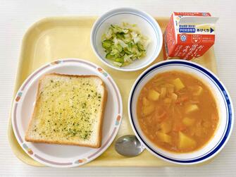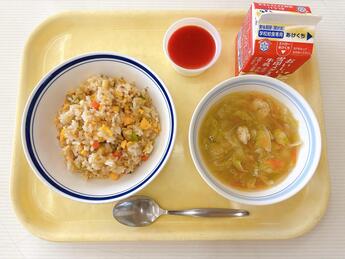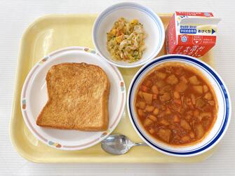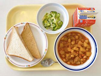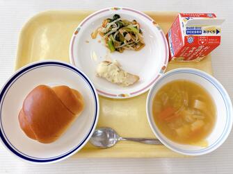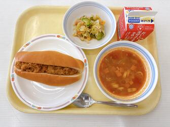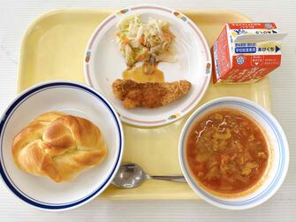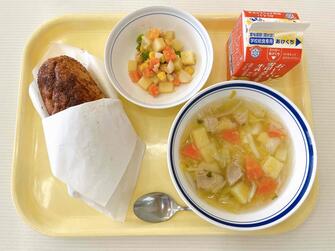 今日は減塩献立です。パンは塩分量が多いため(1個当たり0.7g)、パンの献立は塩分量が多くなりがちです。トマトの酸味やチップスの香ばしさで塩分が少なくてもおいしく食べられるように工夫しています。