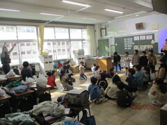 昨年度までは全校を2回に分けて行いましたが、今年度は3回に分けて行いました。時間は今回の方が短くなりましたが、1クラス平均3、4のグループに分けて「少人数制」となったため、より密度の濃い交流が行われました。教室を移動する留学生たちからは「(児童たちが)アクティブー」「グー」という言葉や満面の笑みがあふれていました。各教室の様子を覗くと・・・