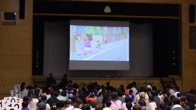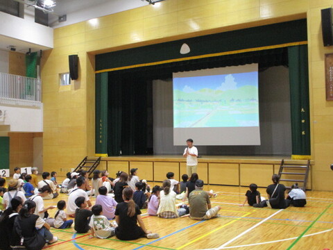 はじめに、安全な花火の扱い方を体育館で映像を交えながら矢口消防署西六郷出張所の方に説明していただきました。