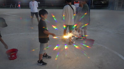 花火に付いていたピンク色の眼鏡を掛けると、なんと、花火が虹のように見えるそうです。そんな不思議な眼鏡を掛けて楽しむ子もいました。