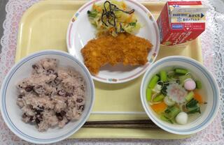 赤飯 ロックチキン 昆布サラダ お祝いスープ 牛乳
