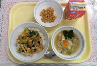 小松菜と豚肉の中華丼 豆腐とわかめのスープ 甘辛カリカリ豆 牛乳