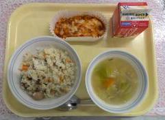 ピラフ 豆腐のミートグラタン 白菜とじゃがいものスープ 牛乳