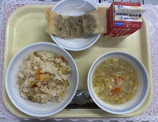 キムたくごはん 棒ぎょうざ コーンたまごスープ 牛乳