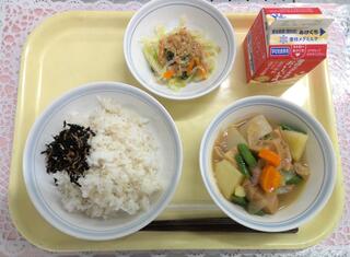 ごはん 海苔ふりかけ 肉じゃが煮 野菜のごま酢和え 牛乳