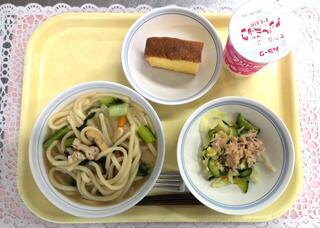 五目うどん 飲むヨーグルト ツナサラダ ぐりとぐらのケーキ