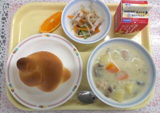 スイートロールパン 米粉のクリームシチュー もやしサラダ 清見オレンジ 牛乳