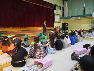2月5日(月曜)の全校朝会で、保健給食委員会の児童が、身だしなみについての話をしました。