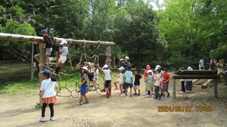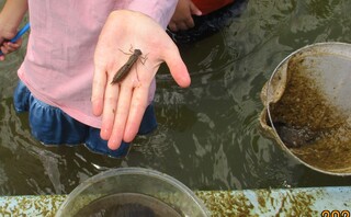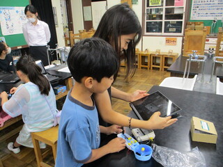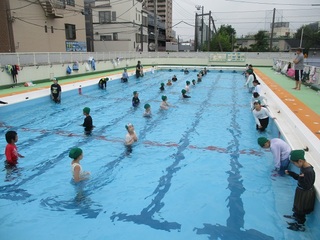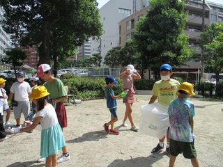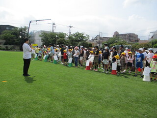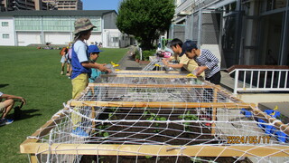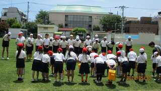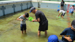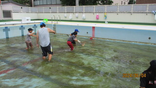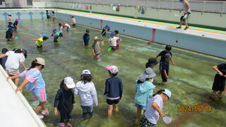 午後は、プールで「ヤゴレスキュー」。足までの水位になったプールでの活動に興奮気味。先生方もこどもたちと一生懸命レスキュー活動に取り組みました。最初はなかなか見つけられなかったヤゴでしたが、合計30匹ほどお助けすることができました。この活動をきっかけに、自然環境への関心を高めてほしいと思います。(校長)