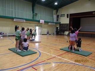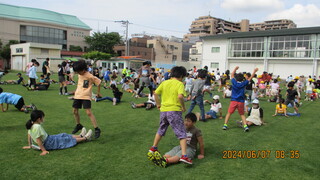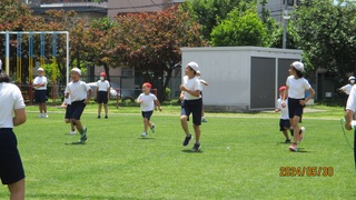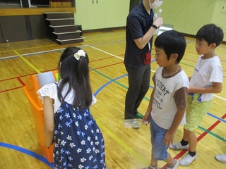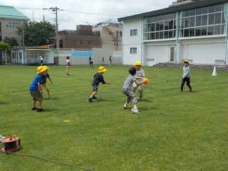 『とんくる体操』をして「投げる」「捕る」の練習をした後、『バックホームゲーム』をして、楽しみながらたくさん体を動かしました。