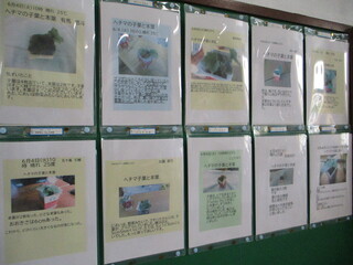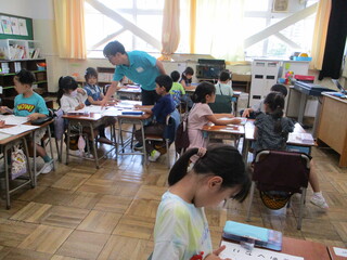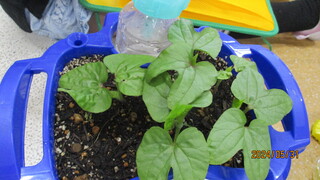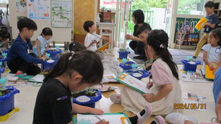 1時間目と2時間目は雨が降っていたので、玄関で観察をしていました。はっぱの形や色などをじっくり見て、観察カードに絵や文で表していました。なかには、「あさがおに名前を付ける!」と言っていた子もいました。嬉しいですね。自分のあさがおを大切に育てたい気持ちが伝わります。毎日のお世話を通して、生き物への親しみをもち、大切にしようとする気持ちを育めるようにしていきます。(校長)