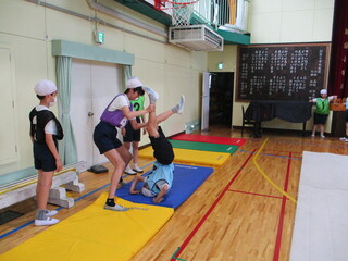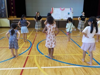 チアリーディングでは、2・3年生の女の子たちが集まり、あっという間にステップを覚え、音楽に合わせて動き、最後にみんなでかっこよくポーズを決めました。