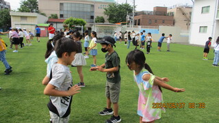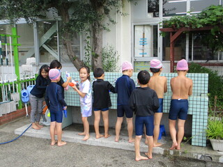 校長室にいたら、校庭から「きゃー!」と嬉しそうな声が聞こえてきました。外へ行ってみると、こどもたちと先生で楽しく「みずあそび」を行っていました。遊びを通して夏の特徴に気付いたり、友達と協力して遊ぶを工夫して楽しんだりすることををめあてとしています。(校長)
