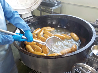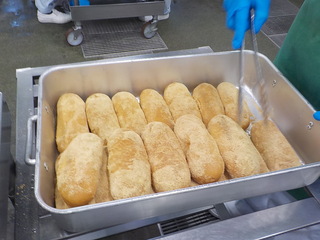 あげパンは、全国的に人気の給食メニューですが、大田区の嶺町小学校が発祥の献立と言われています。固くなったパンをおいしく食べられないかと、当時の調理員さんが考えたそうです。今日はきなこ味のあげパンです。