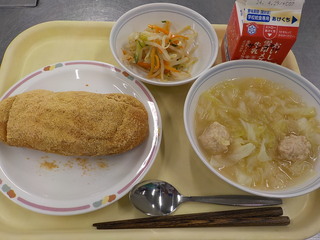 きなこあげパン、牛乳、肉団子スープ、もやしサラダ