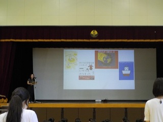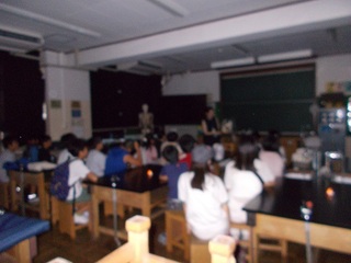 理科室を真っ暗にして、わずかな明かりと効果音を使いこわ~い雰囲気の中、とっても上手に読み聞かせをしてくれました。理科室にある骸骨も登場していましたよ!