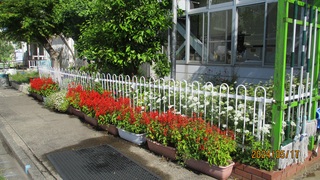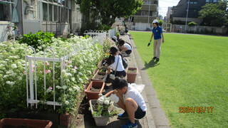校庭に出ると、環境委員の児童が担当の先生と一緒に花壇やプランターの手入れをしていました。2年生は、野菜の苗に水やりをしたり、自分の植木鉢にまいたミニトマトの種の様子を気にして観察したりしてました。前任の校長先生が育てたサルビアも綺麗に咲いています。自然を大切にする気持ちが、様々な場面から伝わります。(校長)