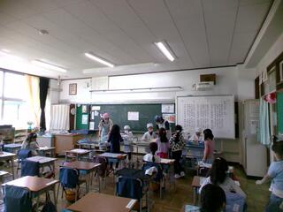 1年生も自分たちの給食は、自分たちで準備します。当番ではない児童は、自分の席で静かに待ちます。