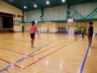 ミニテニス体験教室では、バドミントンのコートを使って、大きめのボールを打つ練習をしました。思いっきりラケットを振っても、そんなに遠くまで行かないので、安心してラケットを振り、最後には、ダブルスの試合も楽しくできました。