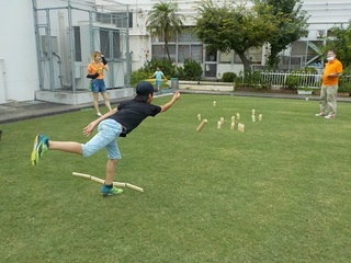 「モルック」とは、木製のモルックを投げて、スキットルを倒し、得点を取り合うフィンランドのスポーツです。得点を考えながら、「あれをねらって!!」とチームで協力して考えながら投げていました。