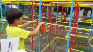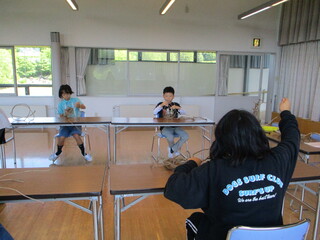 割り箸にゴムを巻き付けるのがなかなか難しく、たくさんの保護者の方が手伝ってくださいました。ゴムの力が強くて遠くまで飛ぶことや二重にすると紙コップまで飛ばすことができることに気づきました。