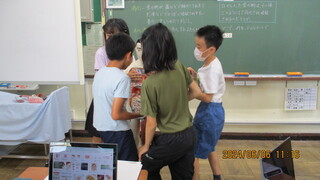 食べ物が消化・吸収される様子をタブレットで調べて、ノートにまとめていました。人体模型で食道の位置を確認している様子も見られました。一人一人が自分のペースで、自分に合った資料を選び、自分でまとめる学習を通して、主体的に学ぶ力を身に付けていきます。(校長)