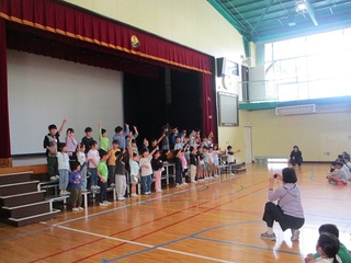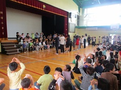1年生を迎える会の様子です。花のアーチをくぐり、1年生と2~6年生が対面で顔合わせをしました。6年生からのユーモアに富んだクイズの出し物に、1年生が振り付きの歌で元気にこたえました。