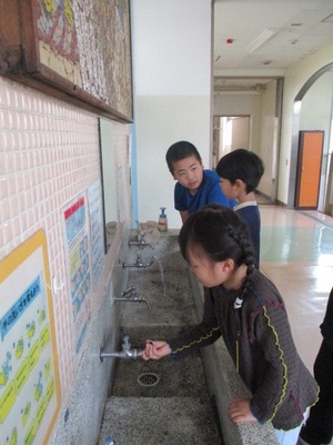 6年生が手洗い場の使い方を丁寧に説明し、