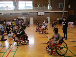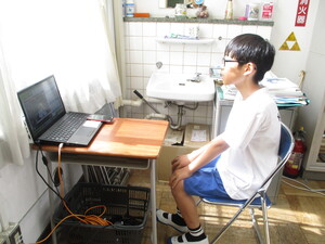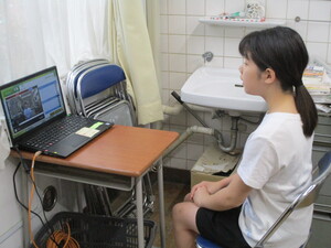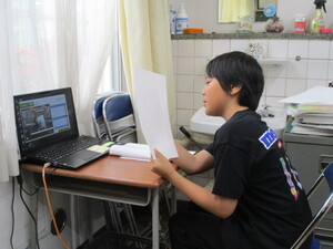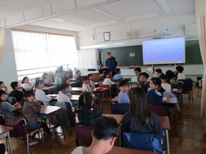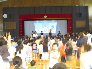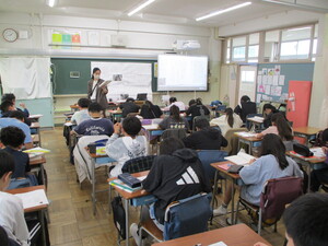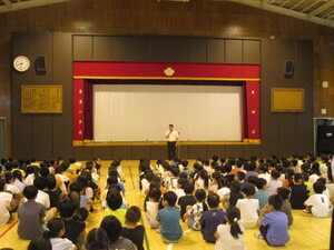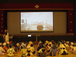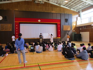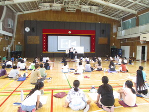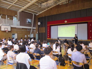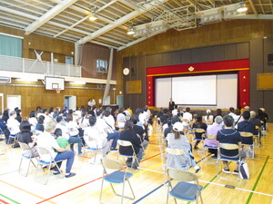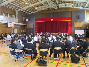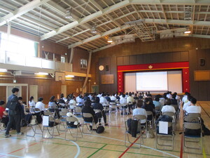 オンラインでつないで、体育館でお話を聞いてい