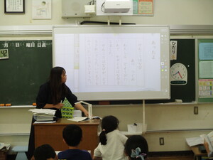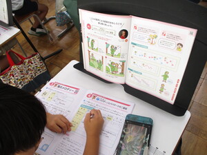 絵日記の宿題の書き方を、実物投影機に投影