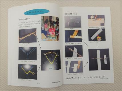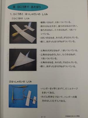 そして、矢口小学校には宝物が隠されているのです。このような「ものづくり科」の教科書なのです。ほらここに、大田区立矢口小学校と書いてあるでしょう。矢口小学校の先輩たちが作った、ものづくりの教科書があるのです。開いて中を見てみると、「オリジナルうちわを作ろう」とか、「綿で作ってみよう」とか、「使える箸を作って、うどんを食べてみよう」など、楽しそうな内容なのです。そこで、私もこの教科書を使って、何かやってみようと思いまして、「ゴムを使ったおもちゃを作ってみよう」というページ、これをやってみました。「ゴムで飛ばす飛行機を作ってみよう」というページを見まして、その通りにやってみました。