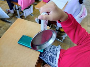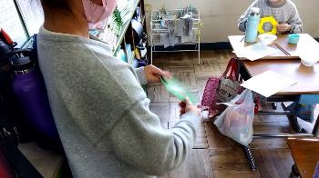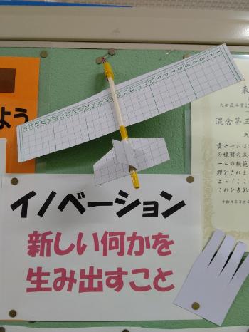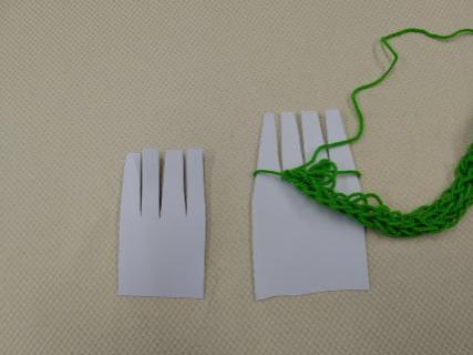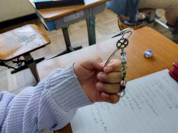 前に「指編み」を教えましたね。たくさんのお友達が校長室に来て、「指編みやりたいです」と取り組んでくれています。そこで一つ、問題が起こりました。指編みを途中で止めて、指から外してしまうと、せっかく編んだのに、バラバラと元の1本の毛糸にもどってしまう問題です。そこで、4年生のMさんが考えました。「この問題(課題)をどうしたら解決できるだろう。」と考えて、イノベーションを行ってくれました。イノベーションとは何かというと、新しい何かを生み出すこと。アイデアでもいいですし、考え方でもいい。物でもいいし、そうした何か新しいことを生み出すことをイノベーションと言います。高学年向けに話すと、新しい価値とかね。たとえば会社だったら、今までに使っていなかった新しい道具を生み出すとね。そのようなことをイノベーションと言います。Sさんがイノベーションしてくれたのが、この写真にあるような、紙で4本の指を作るという方法です。ここに毛糸を入れれば、ほどけないで続きをすることができるぞと考え、この「ほどけてしまう」という課題を、問題を解決してくれました。イノベーションしてくれました。これはとても大事なことです。
