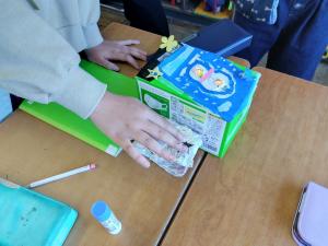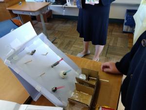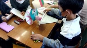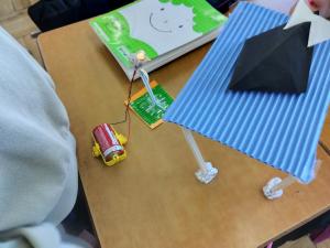 この教科書はとても親切に書いてあって、材料はどんなものが必要ですかということも書いてあります。割り箸、ビニールテープ、工作用紙、ボンド、ゴム、ハンガーなど、このような材料が必要ですと書いてあります。そして、設計図もしっかりかきましょうとも書いてあります。ここに書いてあるように、材料も用紙して、「割り箸飛行機」を作ってみました。ハンガーが何に必要かというと発射台になるのです。けっこうかっこよい感じでしょう。ハンガーで作ってある発射台のゴムを引っ張って、飛ばす準備をします。そして飛ばしてみます。(飛行機が飛ぶ)