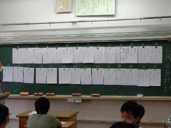 日本学校俳句研究会代表の小山正美先生と講師の阿部郁恵先生による俳句教室を、いよいよ1年生でも行いました。今回は講師の先生のご都合もあり、学習したのは2組と3組です。国語を学びだしたばかりの1年生にとっては、五七五音を数えるだけでもレベルの高い学習になりますが、授業時間を2時間たっぷりとったことがよかったようです。先生方からも、「ゆったり授業をすることができたから、1年生でもよく理解してくれた。」という感想をいただきました。また来週、1組が俳句教室を受ける予定です。これで全18学級で俳句教室を行うことになります。