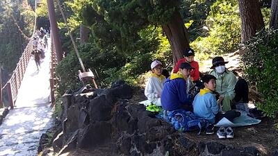 門脇つり橋付近でお弁当を食べる