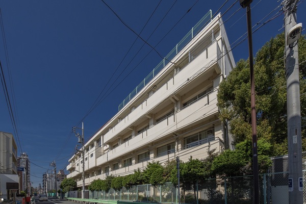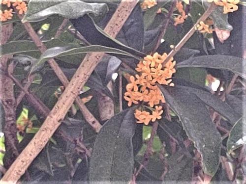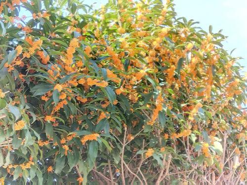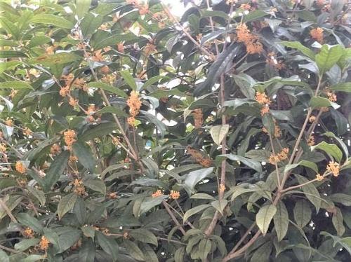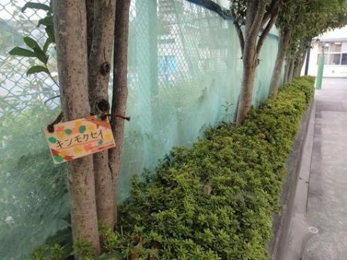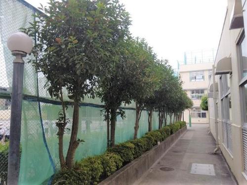 矢口小学校の校庭、給食室前の犬走りは、キンモクセイ並木道となっています。