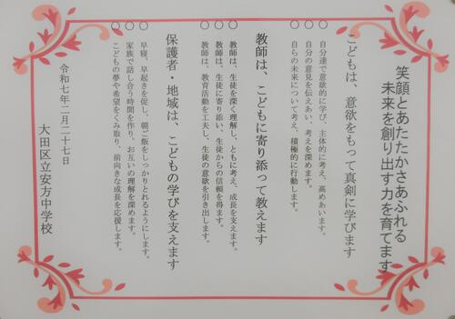 おおた教育ビジョン(第4期大田区教育振興基本計画)に基づき、こども、教師、保護者の姿を示した「大田区立安方中学校こどもポスター」を策定します。本校のこども、教師、保護者・地域の三者で策定したこどもポスターを教室等に掲示し、三者の果たすべきことを明確にすることで、こどもが真剣に学び、教師がこどもに寄り添って教え、保護者・地域が学びを支える学びの場づくりを推進いたします。